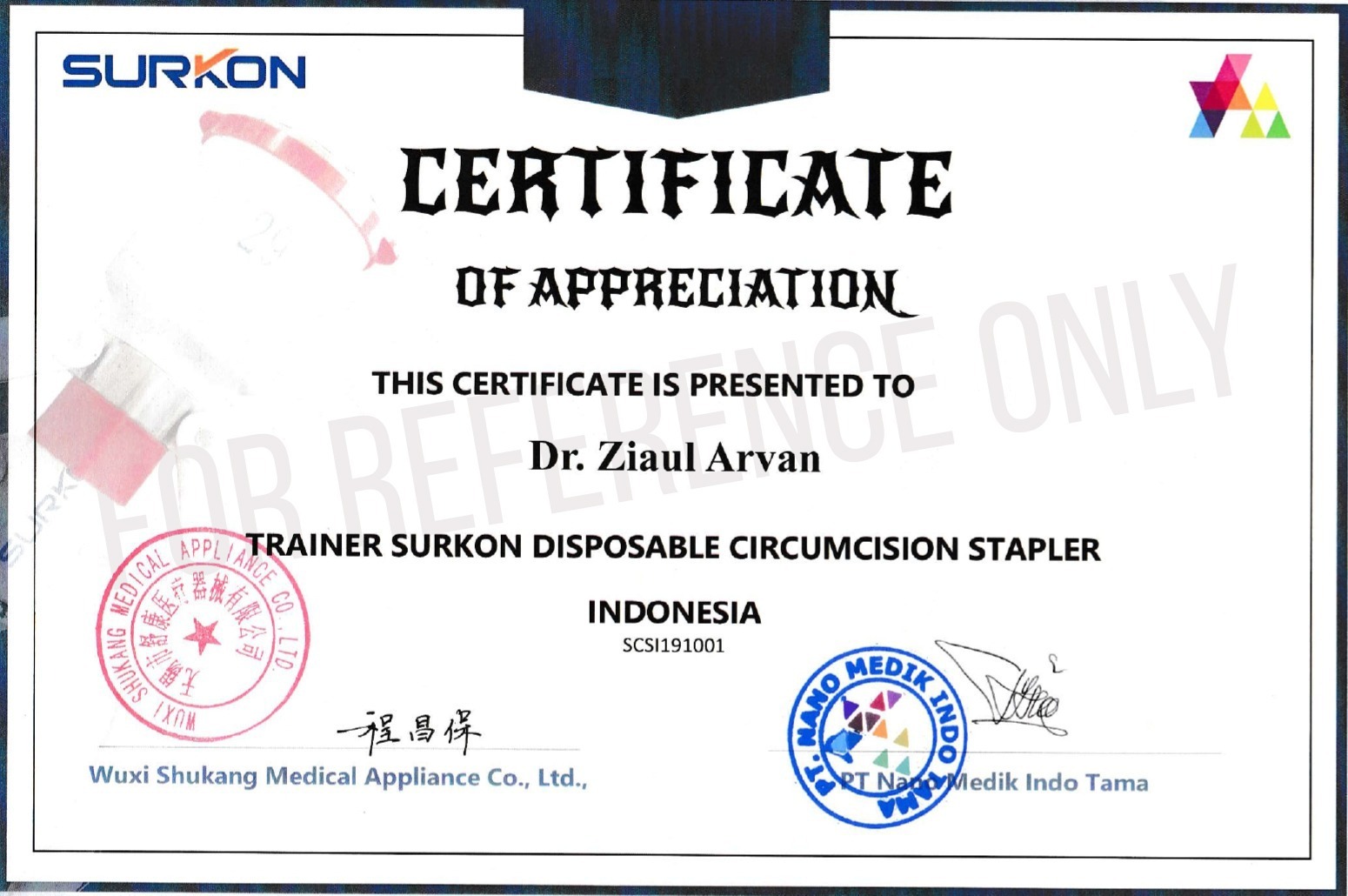 Kami bangga mengumumkan bahwa salah satu dokter terkemuka kami, Dr. Ziaul Arvan, telah memperoleh sertifikasi sebagai pelatih dalam penggunaan Surkon Disposable Circumcision Stapler, yang menunjukkan komitmennya terhadap keunggulan dan inovasi dalam perawatan pasien.